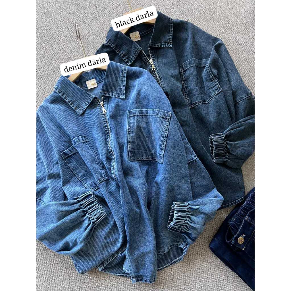 Warna: Denim Darla & Black Darla Bahan: Jeans – Adem dan Nyaman Banget! Size Chart (All Size) L. Dada: 180cm L. Ketiak : 74cm Panjang Lengan: 74cm Panjang Baju: 73cm